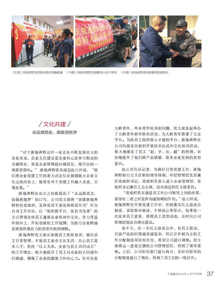 中共浙拖奔野黨組織在步入新時代、走向新起點、踏上新征程的道路上,充分發(fā)揮一名黨員一面旗幟的作用,為企業(yè)的發(fā)展和騰飛作出奉獻(xiàn)。