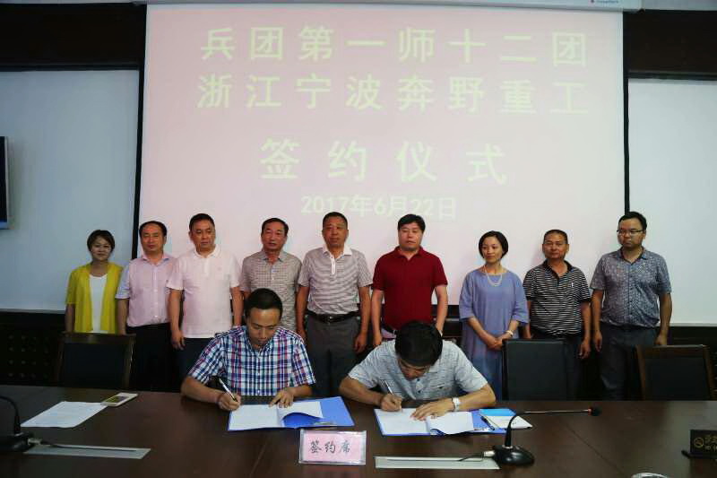 6月22日,寧波奔野重工董事長(zhǎng)王興洪等公司領(lǐng)導(dǎo)在新疆出席兵團(tuán)一師十二團(tuán)項(xiàng)目合作簽約儀式。