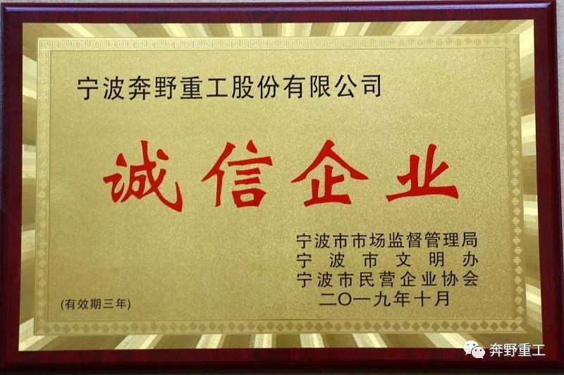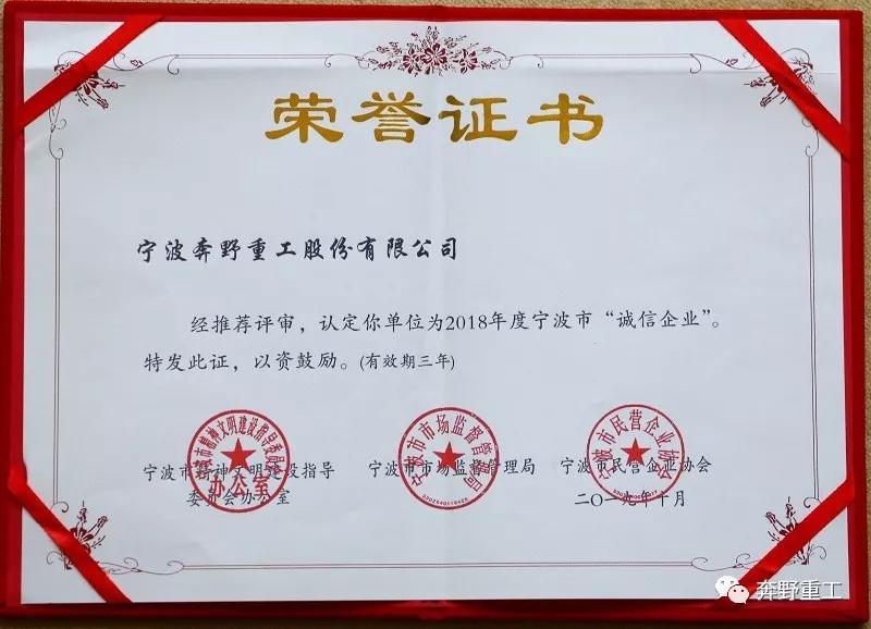 企業(yè)誠(chéng)信,作為企業(yè)文化的重要組成部分,孕育于企業(yè)文化,扎根并滲透于企業(yè)文化,是企業(yè)文化不可或缺的重要組成部分。由寧波市市場(chǎng)監(jiān)督管理局、寧波市文明辦、寧波市民營(yíng)企業(yè)協(xié)會(huì)共同推薦評(píng)審,寧波奔野重工股份有限公司認(rèn)定為2018年度寧波市“誠(chéng)信企業(yè)”。