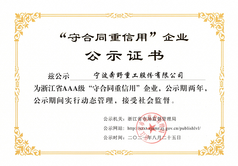 近日,寧波奔野重工股份有限公司再次被浙江省市場(chǎng)監(jiān)督管理局公示為浙江省AAA級(jí)“守合同重信用”企業(yè),公示期2年。