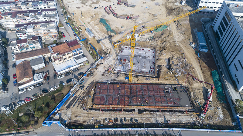 從天空俯瞰下來,1號(hào)車間所在位置正在澆筑梁板。巨大的泵車正在混凝土攪拌車的協(xié)助下,將混凝土源源不斷地抽送到1號(hào)工地上,再由工人們將混凝土震動(dòng)、平整。附近的工人們各司其職,將還未澆筑混凝土區(qū)域的鋼筋、預(yù)埋管線整理好,做好澆筑前的準(zhǔn)備。工地現(xiàn)場負(fù)責(zé)人呂總介紹,按照計(jì)劃,1號(hào)車間要加班加點(diǎn)在今天內(nèi)將整一層全部澆筑完工。