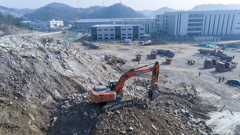 規(guī)劃中的3號(hào)車間、6號(hào)車間所在的位置,3臺(tái)挖機(jī)正在從三個(gè)不同的掘進(jìn)角度轟鳴著將山頭挖低,9輛卡車等在旁邊準(zhǔn)備裝運(yùn),3輛滿載土石的解放大卡和1輛混凝土攪拌車正在駛出工地現(xiàn)場。