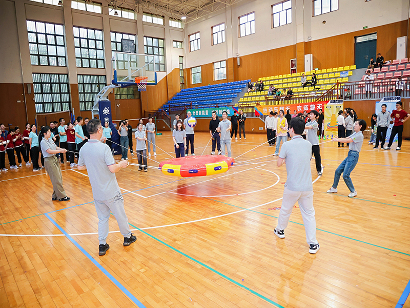 “眾星捧月”一登場(chǎng),就吸引了所有人的目光。隊(duì)員們圍繞在一個(gè)大大的充氣圓盤(pán)周?chē)?,大家各?zhí)一根繩子,眼神專注且堅(jiān)定。通過(guò)默契配合,不斷調(diào)整著圓盤(pán)的高度和角度,既要保證速度,又要穩(wěn)住小球,現(xiàn)場(chǎng)吶喊聲、加油聲此起彼伏。