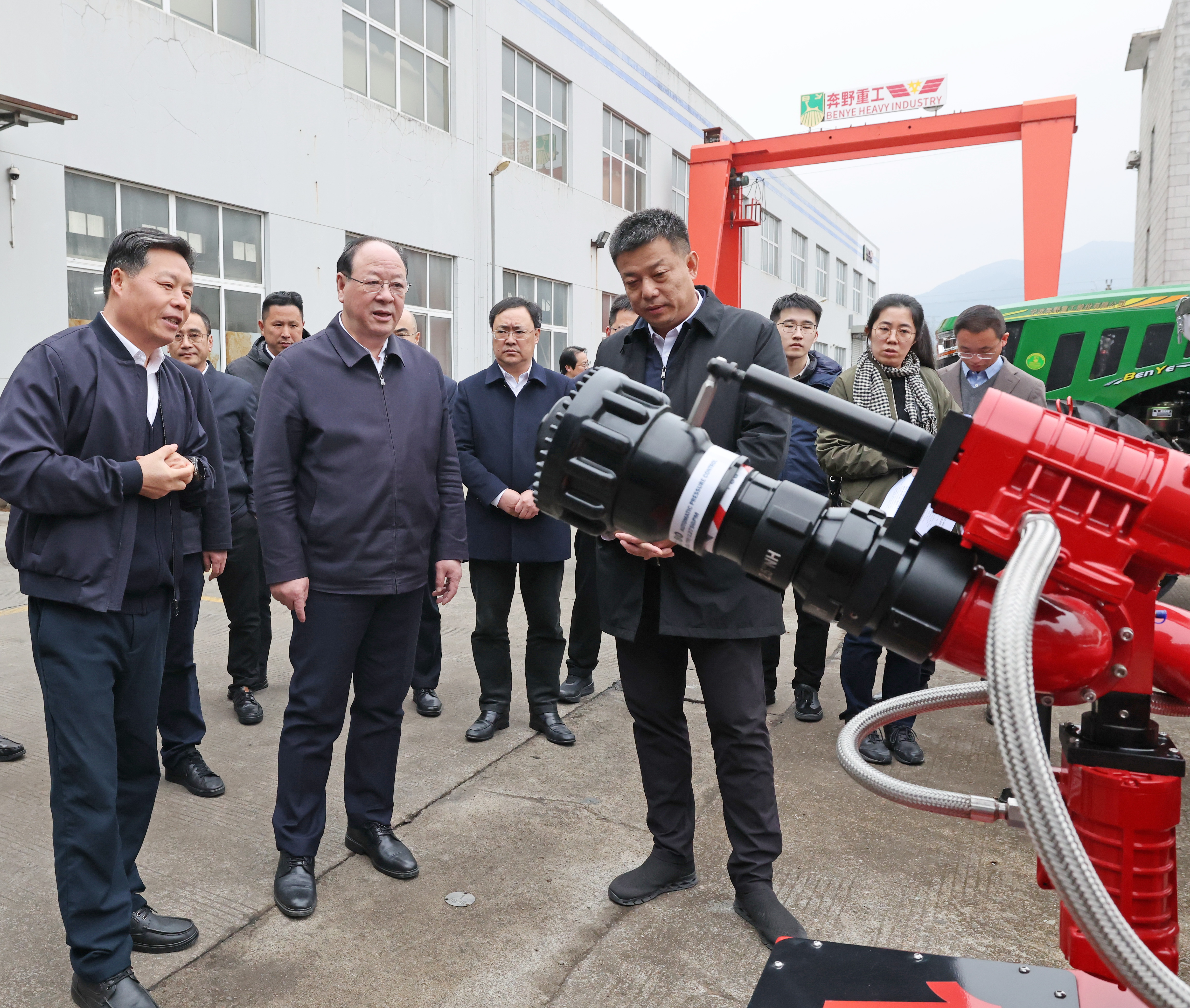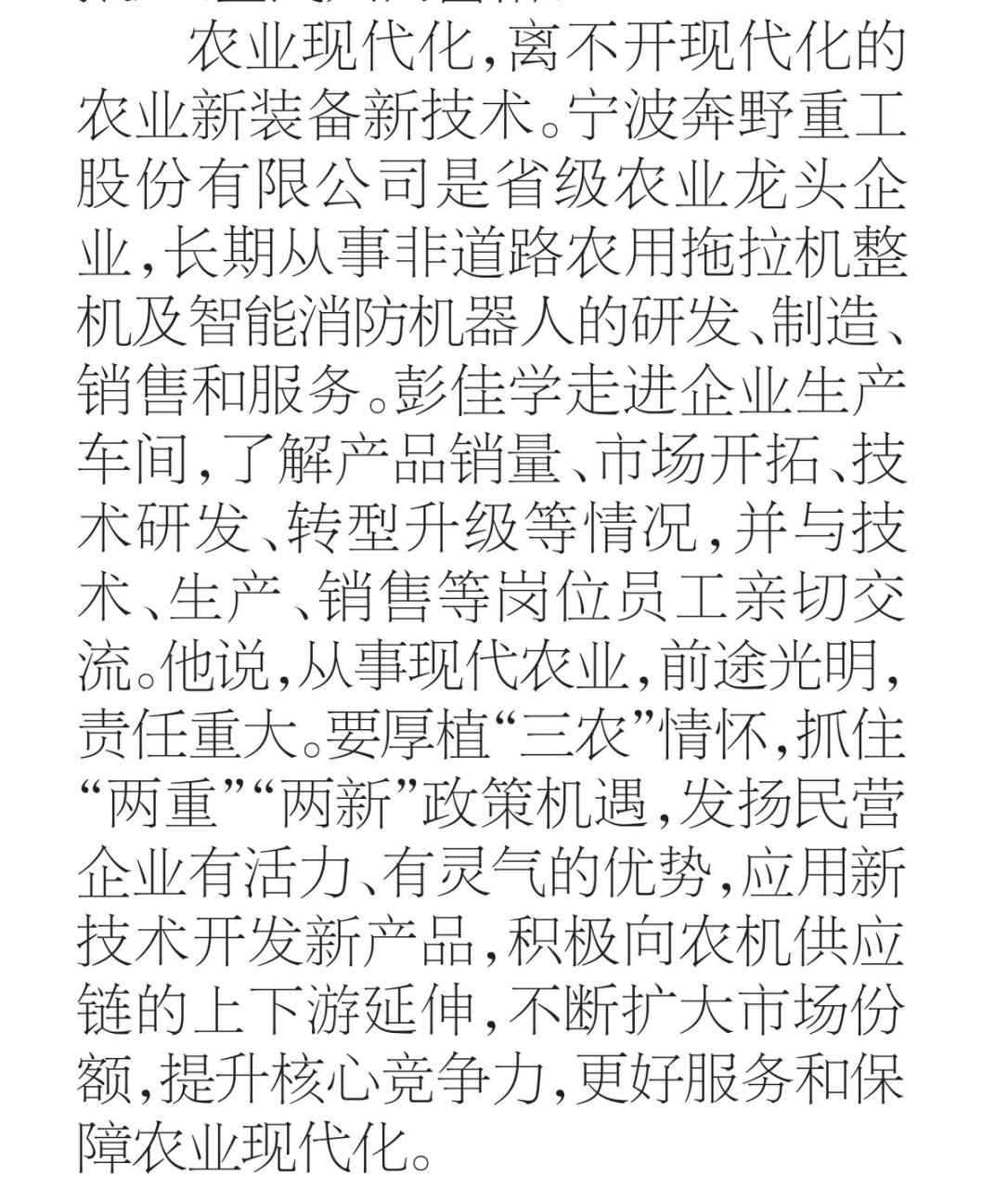 “農(nóng)業(yè)現(xiàn)代化,離不開現(xiàn)代化的農(nóng)業(yè)新裝備新技術(shù)。寧波奔野重工股份有限公司是省級(jí)農(nóng)業(yè)龍頭企業(yè),長期從事非道路農(nóng)用拖拉機(jī)整機(jī)及智能消防機(jī)器人的研發(fā)、制造、銷售和服務(wù)。彭佳學(xué)走進(jìn)企業(yè)生產(chǎn)車間,了解產(chǎn)品銷量、市場開拓、技術(shù)研發(fā)、轉(zhuǎn)型升級(jí)等情況,并與技術(shù)、生產(chǎn)、銷售等崗位員工親切交流。他說,從事現(xiàn)代農(nóng)業(yè),前途光明,責(zé)任重大。要厚植“三農(nóng)”情懷,抓住“兩重”“兩新”政策機(jī)遇,發(fā)揚(yáng)民營企業(yè)有活力、有靈氣的優(yōu)勢,應(yīng)用新技術(shù)開發(fā)新產(chǎn)品,積極向農(nóng)機(jī)供應(yīng)鏈的上下游延伸,不斷擴(kuò)大市場份額,提升核心競爭力,更好服務(wù)和保障農(nóng)業(yè)現(xiàn)代化。”